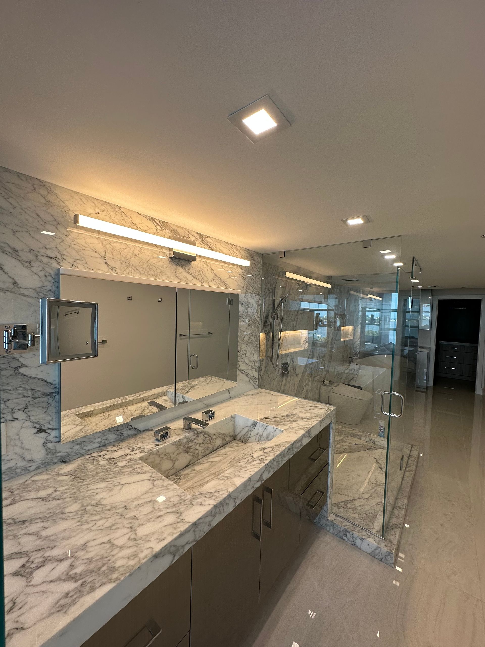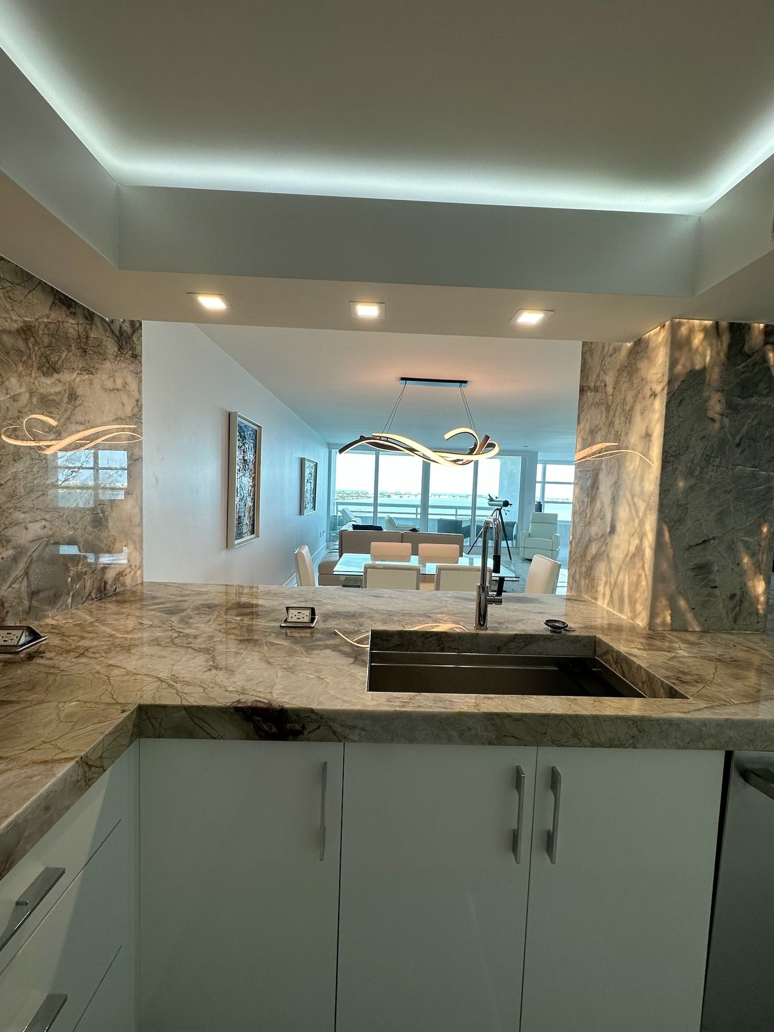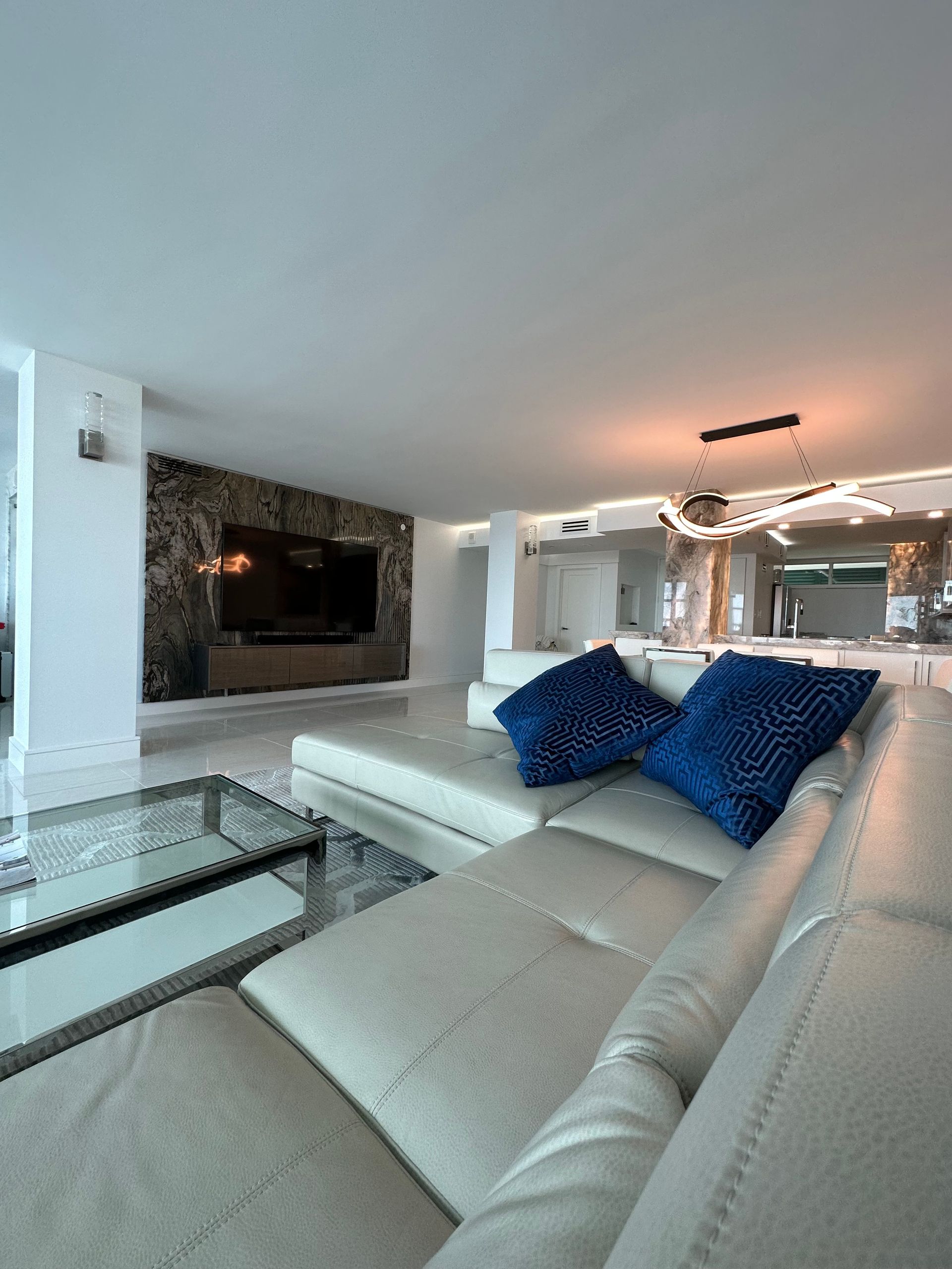 Look at this renovation! What started as a choppy 2-bedroom, 2-bath condo has been transformed into a sleek and spacious 1-bedroom, 1-bath open-concept home. The owner wanted a more functional layout and modern feel, and trusted us to rethink the space from the ground up. We removed walls to create better flow and suggested a unique lighting approach—illuminating the kitchen through the stone and adding a subtle halo of ambient light around the room. The result? A bright, modern, and cohesive living space that the client absolutely loves.