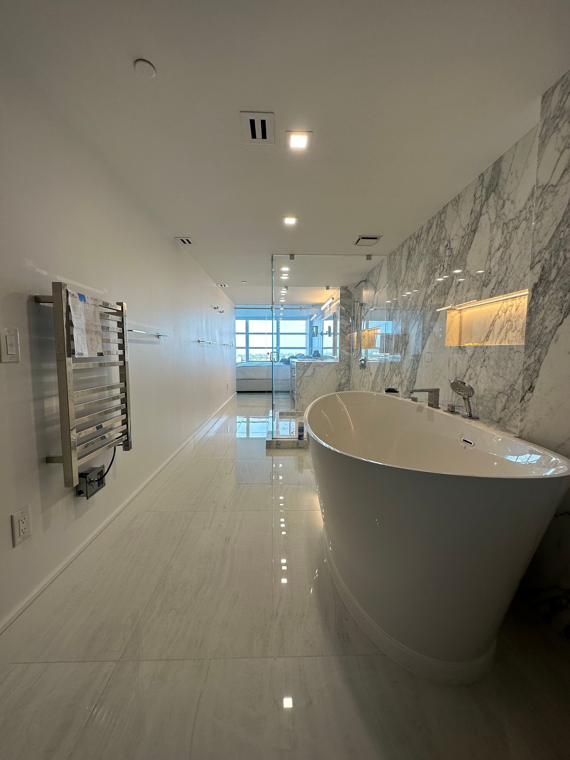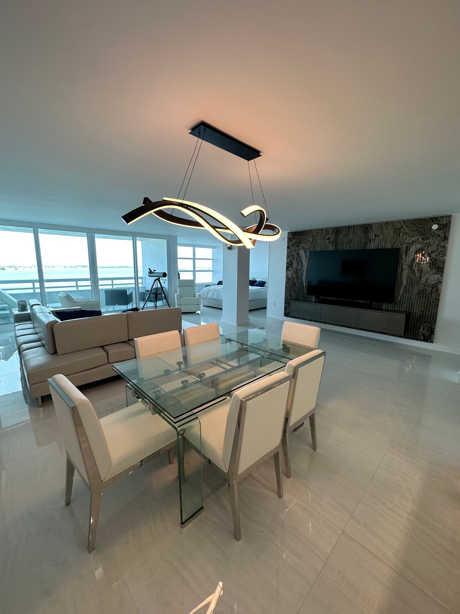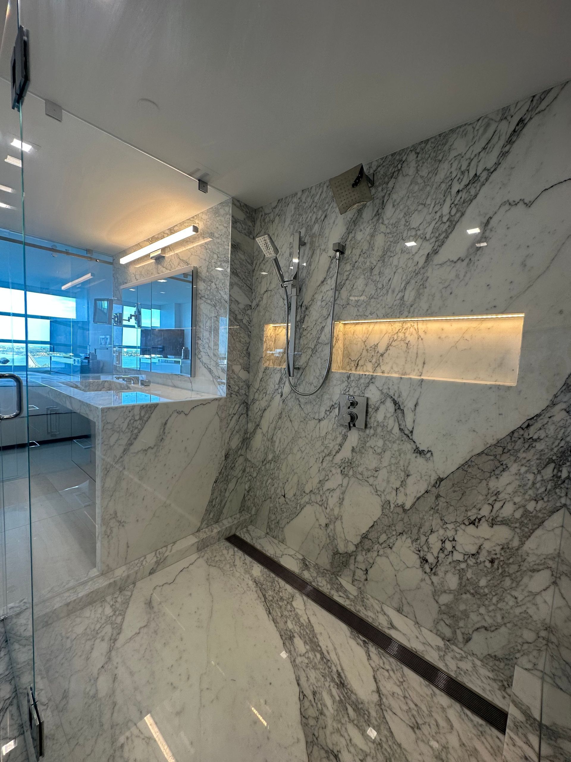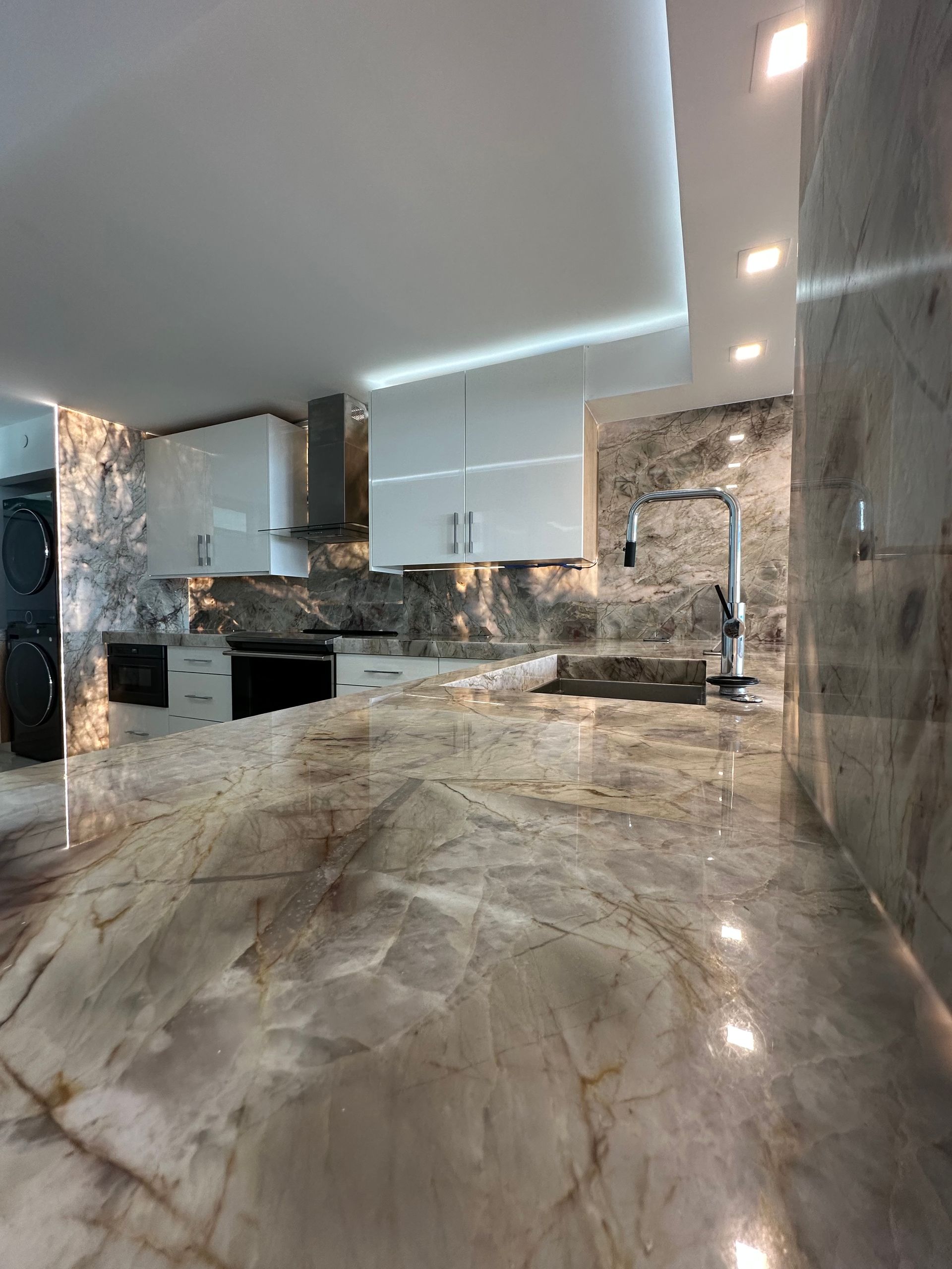 Look at this renovation! What started as a choppy 2-bedroom, 2-bath condo has been transformed into a sleek and spacious 1-bedroom, 1-bath open-concept home. The owner wanted a more functional layout and modern feel, and trusted us to rethink the space from the ground up. We removed walls to create better flow and suggested a unique lighting approach—illuminating the kitchen through the stone and adding a subtle halo of ambient light around the room. The result? A bright, modern, and cohesive living space that the client absolutely loves.